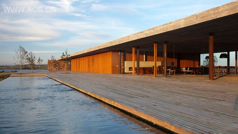 另一个基本概念是在合理分布的柱子和侧向支撑的石墙组成的平板结构基础上,清晰简洁地开展一项计划。在这样的木板下面,木框包含卧室(可望向水库)和厨房(可望向庭院)等空间。在木箱两端,两个全封闭玻璃房子的起居室构建起房子的整个结构。而且,在屋顶下,附近的石壁划定了房屋南侧的空间,有一个烧烤台和对水库和后庭院开放的覆盖式阳台。在房子的前面,水域、大甲板和游泳池组成了主要的外部生活空间。