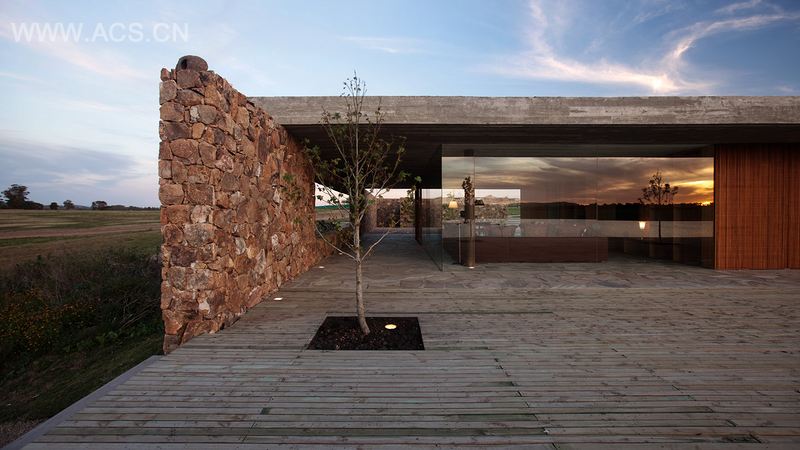 蓬塔房子坐落于乌拉圭靠近蓬塔德尔东帝汶市乡村水库旁的一块开放性空地上。从一开始,这个开放性乡村荒原上的住宅位置便增加了其创造私人空间以及在某种视觉和气候程度上的挑战。一开始就开展一级住宅工程,一边可以眺望水库,而另一边延伸至石墙堆砌的内部庭院,并最终界定房子的所有空间。