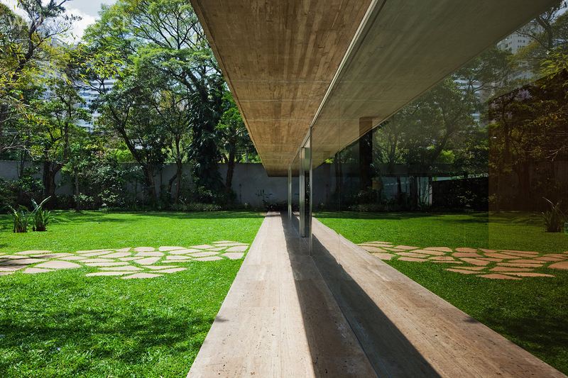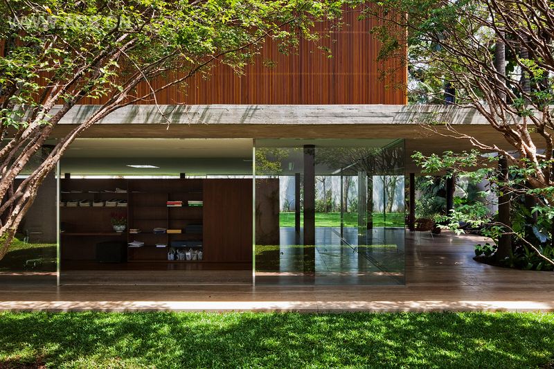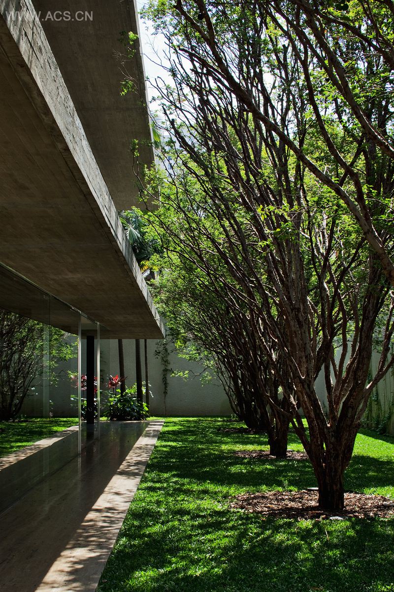 此处地形容许房屋进行纵向排列设计,房屋两端留有空间及树荫花园。建筑外观的简约性最终却形成了复杂的空间架构。由客厅延伸的平台形成一个带有外部壁炉的中央生活空间。客厅里的办公室以一道屏障为界,与其他空间相分离,却与美丽的jabuticabeiras后院相连。二楼主卧室和浴室朝向阳台横梁,俯瞰越过一楼梁顶的树梢。