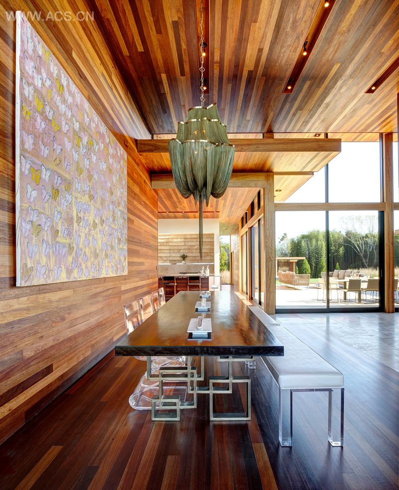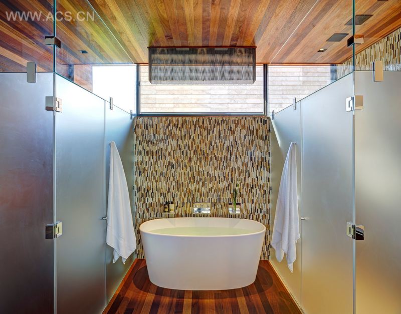 壁炉是一个实用型物件,也是一件精雕细琢的雕塑艺术品。它掩盖力矩框架,支持起餐厅和客厅的大型开放式物体的横向荷载。房屋还设有一个衣橱及HVAC部件。交叠重复的青铜组件是由数字化制作并当场组装而成的。我们对不同的铜绿形成过程进行了研究,从而达到深色青铜面对房间,抛光青铜放在室内遮光罩上的效果。日光经抛光的青铜器反射,并从重叠结构的空隙处过滤进来。主卧室床头使用的重叠条带类皮革也采用了类似的施工方法。