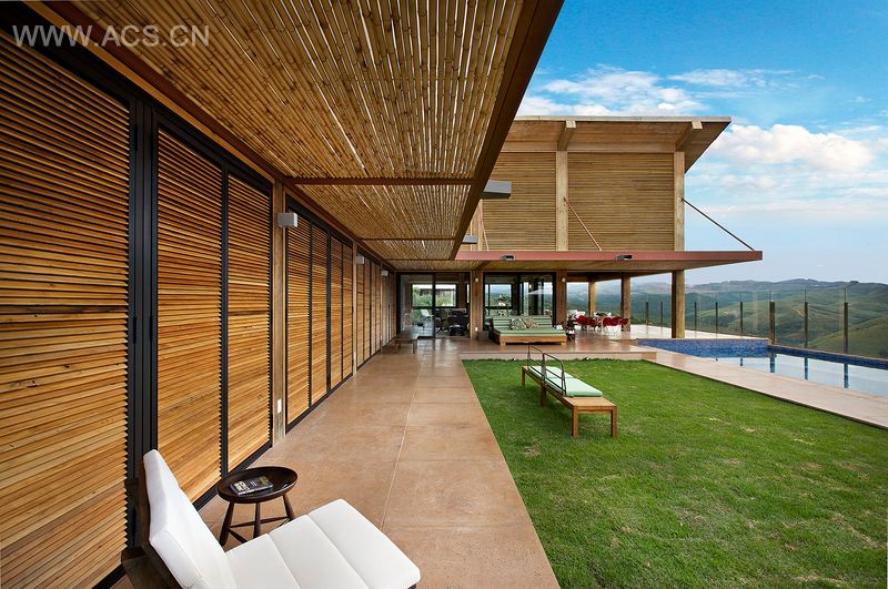 阳台的悬臂屋顶由钢结构、竹子和聚碳酸酯材料遮蔽构建而成,体现出一种乡村气息。