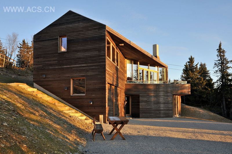 小木屋位于1000米海拔高的山上,靠近滑雪斜坡,它沿地形轮廓而建,为一个大家庭营造度假空间。