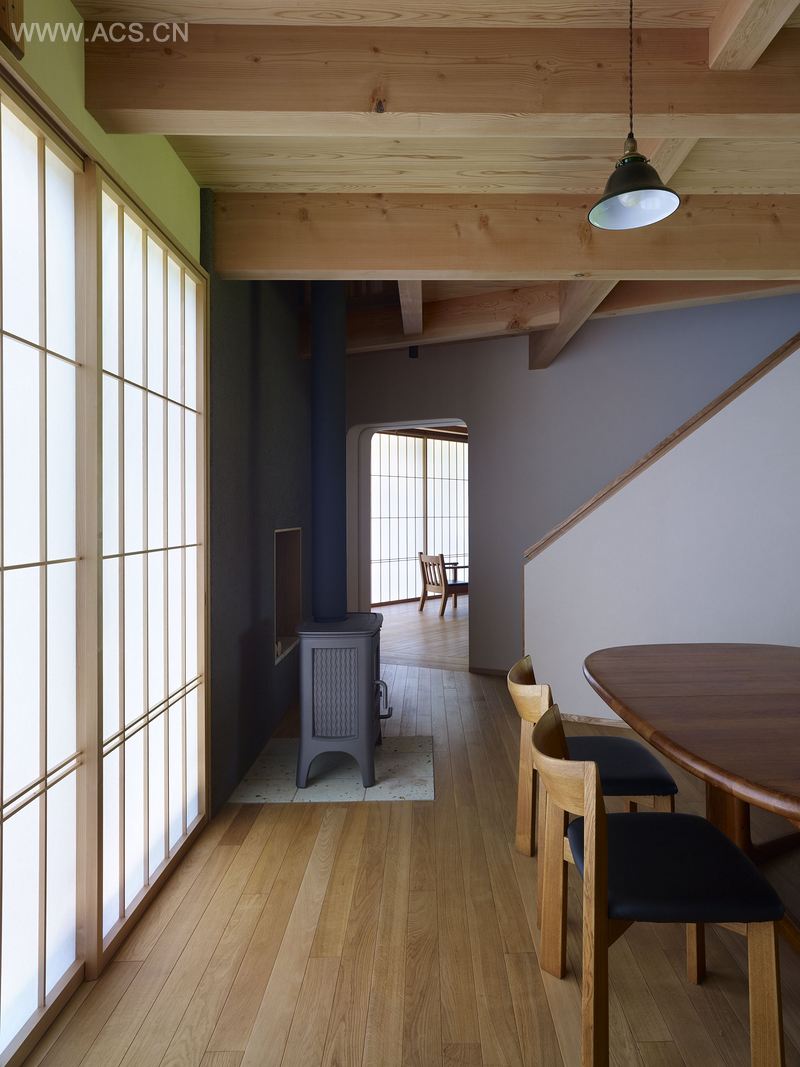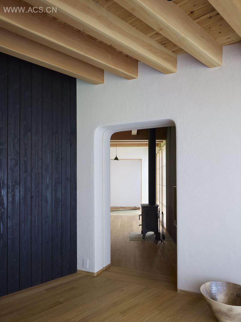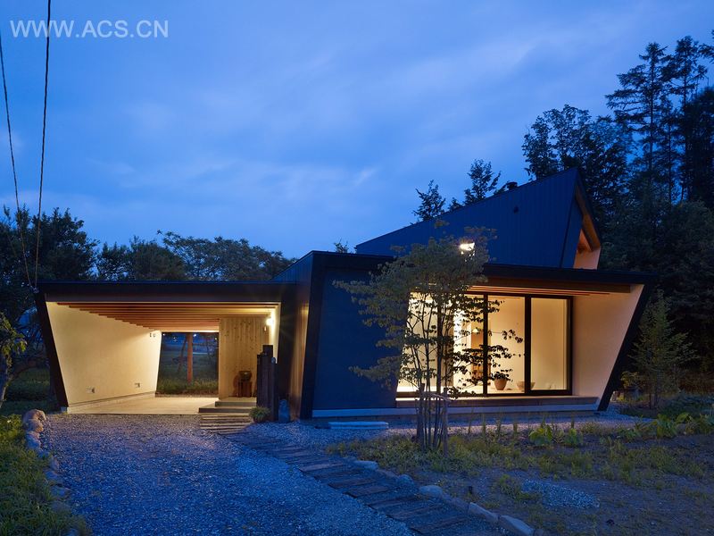 该度假屋坐落在太八岳山脚,与周围的自然景致柔和的融为一体。度假屋呈扇形设计,朝南,在寒冷的冬季能获得大量的太阳光线:无论在一天之中的何时,这儿总有一个地方可以晒太阳。相反,强烈的夏季阳光被屋顶和侧墙阻挡,因为屋顶和侧墙伸出外立面为屋子遮阴。在北面和南面外墙的窗户为屋子带来凉风。这些设计策略的结果是:度假屋有着简单的结构,却充满了丰富多样的景色。