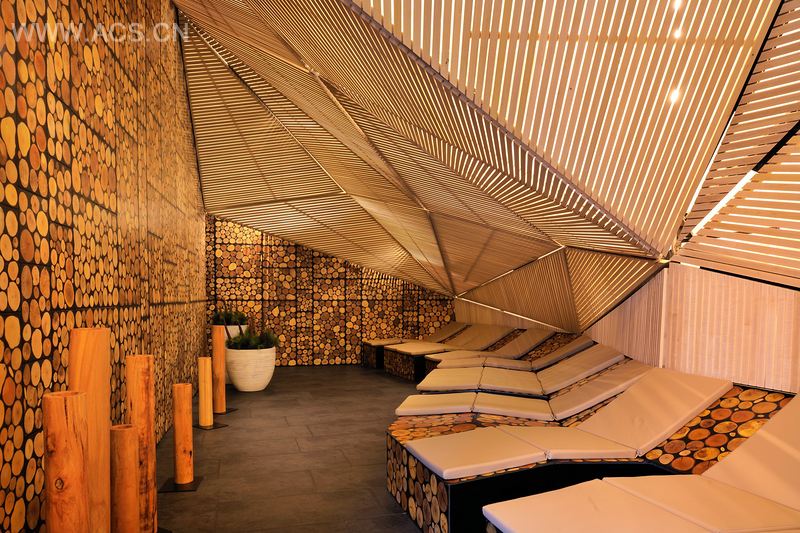 基本设计元素的运用,以及对选材和用色的把握,使得室内空间贴近自然。由于健身中心主要用于娱乐休闲而非体育竞技,因此,保证空间的高私密性,也是设计的重要方面。多元化的空间便于顾客自由穿行,而没有拥挤感。依此思路,还设计出色彩缤纷的水面,将泳池变为休闲浴场。