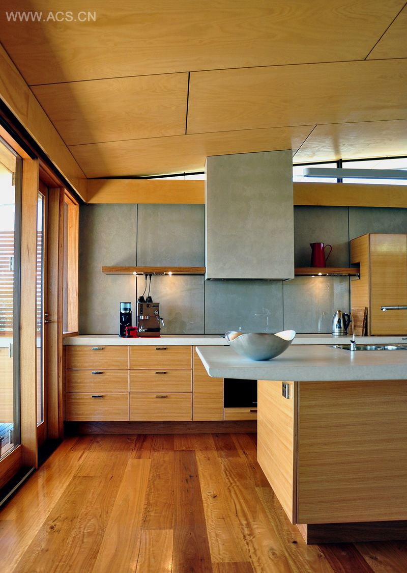 楼上是厨房和起居室,海岸峭壁和南部海洋的壮丽景色,尽收眼底。庭院将起居室和内部空间隔开,内部有主卧、书房、浴室和客卧。胶合天花板铺设整个房间顶部,呈弧形,让人联想起游艇船体。