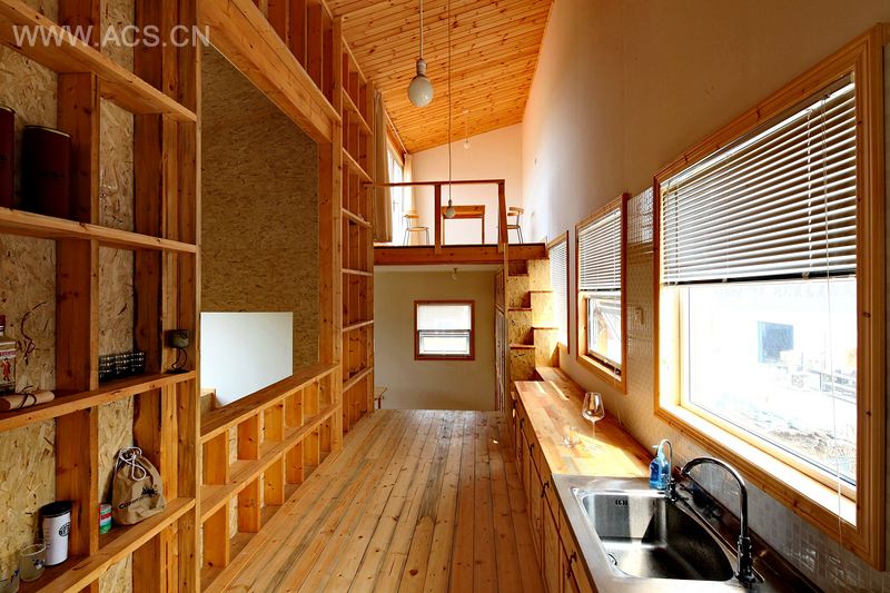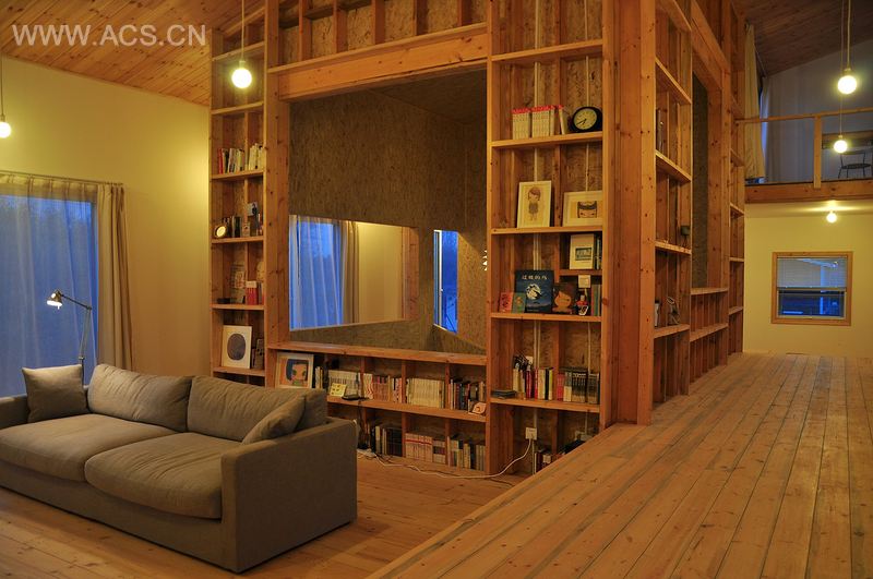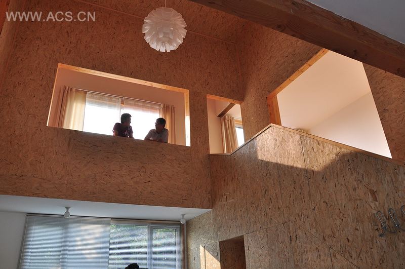 这是一栋利用原有单层平房改建和加建而成的工作室与住宅。原有建筑为有着倾斜屋顶的砖结构,现在,SLOW建筑师将原有坡顶去掉,利用原来的墙体和新加设的轻型木结构墙体,加建为一个局部三层的混合结构房屋。由于基地周围环境较为凌乱,所以将首层设计为不怕打扰的木工工房,将居住的功能提升到能够看到西侧果园和农田景观的二层,三层设计了两个阁楼空间和户外平台。住宅的内部功能分成几个平台,沿着围绕二层中庭螺旋上升的流线展开,从一楼的工房到二层的餐厅、起居室、厨房,最后到三层的阁楼和户外平台。平台间的高差设计成使得有些台面既是地板又是宽大的坐席,可以自然地席地而坐,给人一种轻松自在的氛围。该住宅也是轻型木结构在中国的一个早期试验。