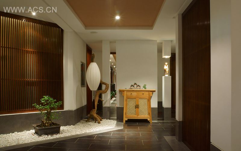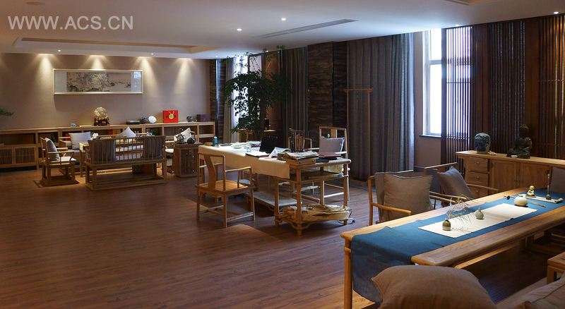 “南池”取自李郢的诗“日出两杆鱼正食,一家欢笑在南池”,意思是一家人出游,在南池边钓鱼,既悠闲又充满乐趣。这正是南池茶舍的寓意——希望现代人能够留意、体会平凡生活中的快乐、自在和悠闲。茶舍的设计主题定位为“生活中的禅茶印象”,以生活见自然,运用国画、书法及新明式家具等中式元素打造“禅茶一味”的韵味空间。茶舍分两层,一层为茶及茶器的卖场,二层分为茶友区和茶友沙龙区,三个区域相互递进又互有补充。
