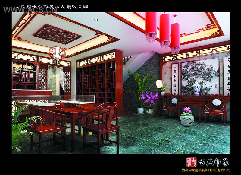 茶馆大厅运用中式设计手法。青砖、青石、青竹、古筝和中式家具等元素的运用,使得茶馆古典中透露着淡淡的田园风情。