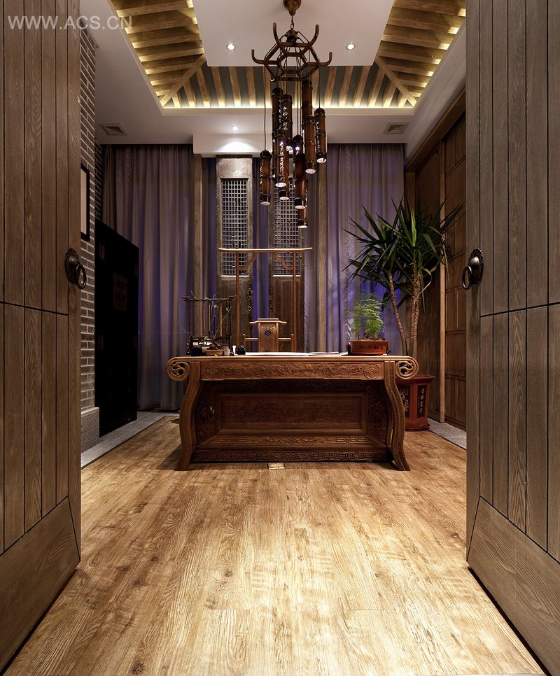 徽派建筑讲究四水归堂,上有天井,下有水景,设计师有意将室内一二层景观相互渗透,在空间中层层套接,每一处看似各自独立,却又能融合成一个整体。由此,设计师在本案中运用人造天井,间设假山水景,巧妙地连接起上下层楼。一楼可以看到人造天井,通透晶莹,采光效果良好;二楼顾客可以围绕天井欣赏一楼布景,鹤与流水的造景相映成趣,给人一种回归自然的纯朴感觉。
