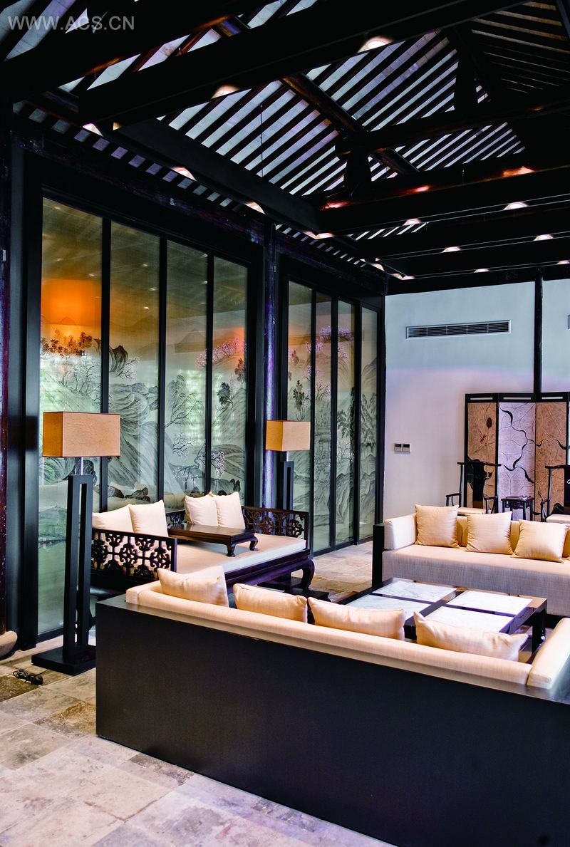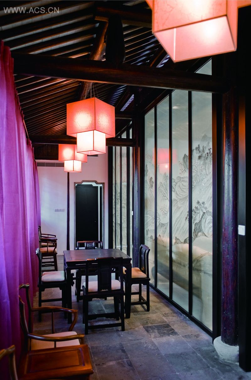 飞檐、廊角含蓄而古朴,木门、圆柱保留了老建筑的神韵,简化的现代灯笼设计、中式茶几与现代布艺沙发的结合,共同营造了舒适、惬意的氛围。