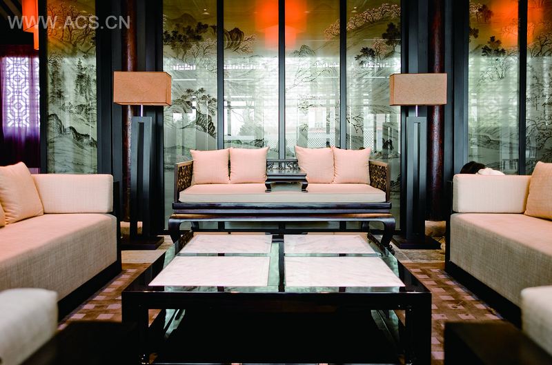 室内空间中并没有去破坏老建筑的形式以及结构,只是用了12扇高大的屏风把整个空间巧妙地分为两个部分——前厅和后厅。这既满足了对功能的要求,又丰富了空间的层次感。屏风为一幅气势宏魄的水墨绢画,使整个空间大气又不失细腻。