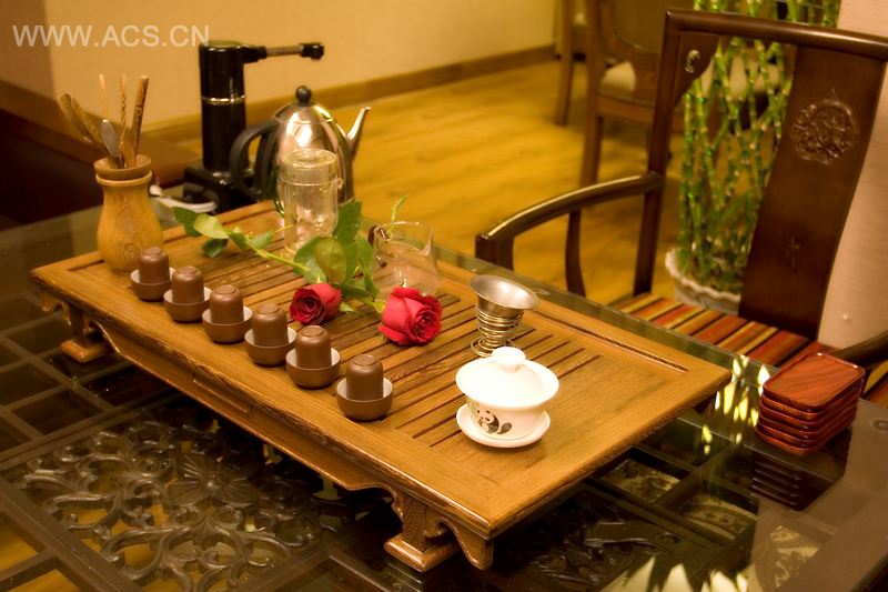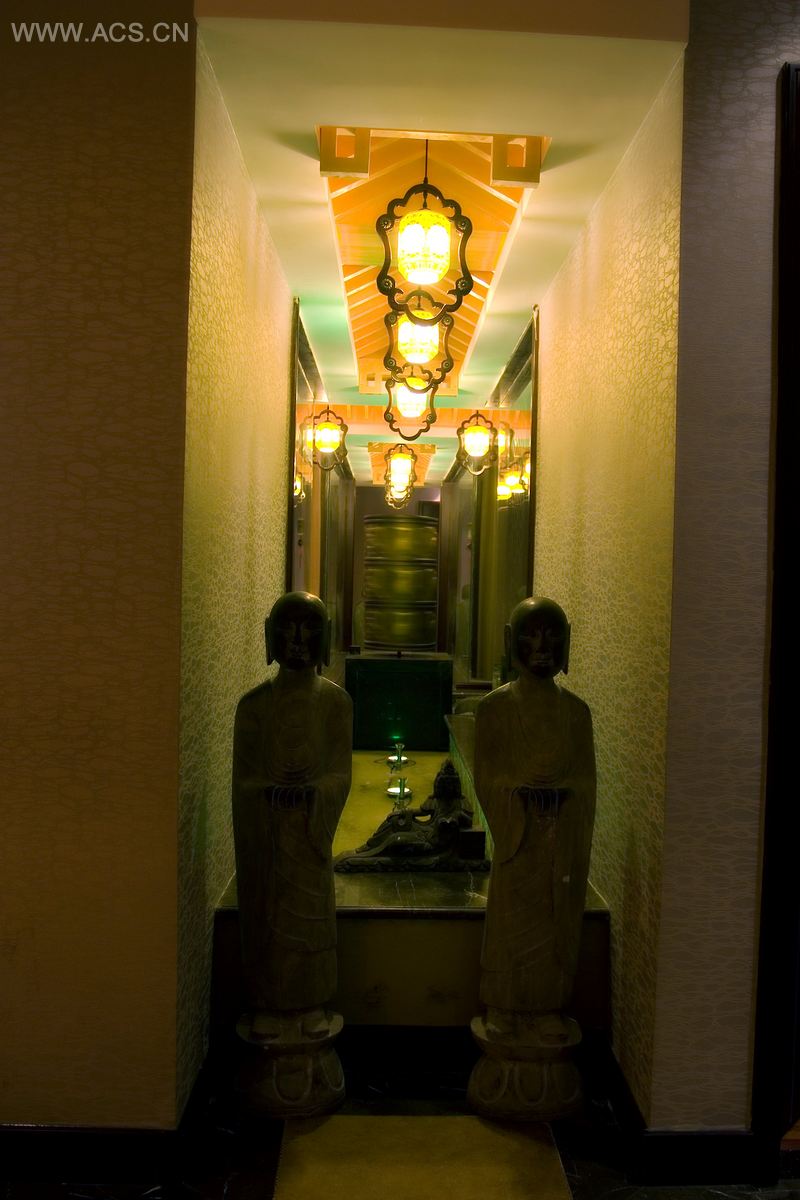 本案设计将现代审美与历史悠久的传统艺术形式相融合,进行了大胆尝试。在喧哗的都市中构筑一隅清香的情趣之地。传统中式艺术形式与现代材质的结合出人意料又顺理成章,譬如:金属地砖采用传统铺装形式;茶圣陆羽画像以国画线描的形式在金属墙砖上表现;手绘绢画在吊顶上给人带来的惊喜;二层水景观的转经筒与整个环境交相辉映。创意无一不体现在舒畅的现代空间里,所有物件被重新定位,展示截然不同的价值。