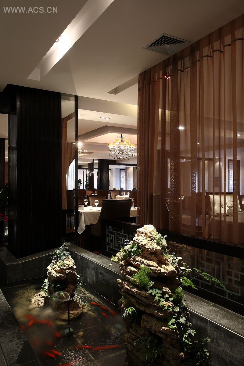 主线中的节点设计:一是淮扬菜的精髓。以味为核心,以养为目的,延展到空间设计中“以景为核心,以惬意为目的”虚境实景相结合(水墨江南墙画、小桥流水虚实交映)。二是盐商富而雅的生活情趣。生活化的空间“静”“雅”“趣”透过景观的布置,使得客人在行走过程中体验“游园---读园---赏园”空间情趣,门厅的青山碧荷,过厅的诗词歌赋,大厅的锦鲤戏水共同勾勒出江南富雅的生活。三是腌渍古韵。一反江南菜的甜腻,适合天津当地口味。四是长江与运河。没有长江与运河就没有淮扬菜的繁荣,门厅的青山碧荷,墙壁淡雅的江南主题的泼墨画书写着江南的一派繁荣。