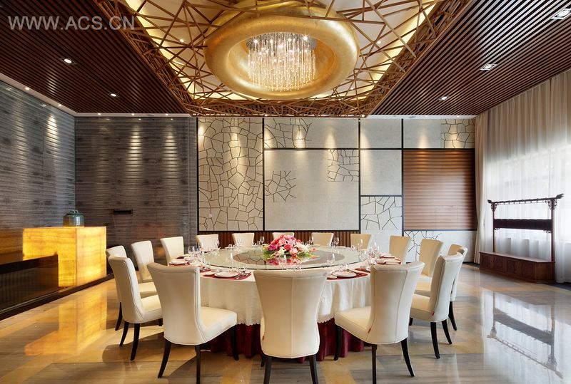 铁板烧包间是宾主之间的亲密交流,在空间上与四周自然环境也更加亲密。多宝格形式组合成的书架灯是空间的重点。