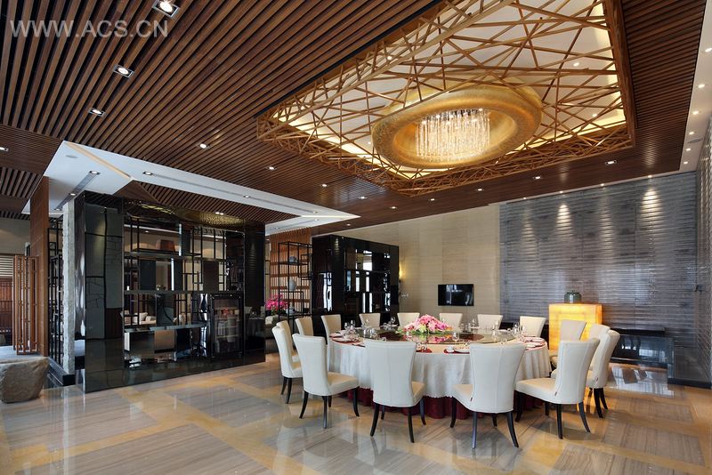 书房空间的墙被打开以多宝格的形式结合了陈列与户外的景观为一体,成为空间的主题墙,陈列代表的是主人的心思与文化,借此与宾客交流。传统中式大屋顶的元素,在这不是展示复杂木构造的美,而是反转处理外屋顶轮廓线的美,以一种简单大方的结构呈现空间感,往下与脱开的多宝格空间结合,形成一种新的天地墙关系。书房空间的周围是一圈服务动线结合水系,水系内有观赏锦鲤及大石,延伸结合用餐空间的景观瀑布的,其中部隔着落地窗与户外的水池形成水连天的景观。