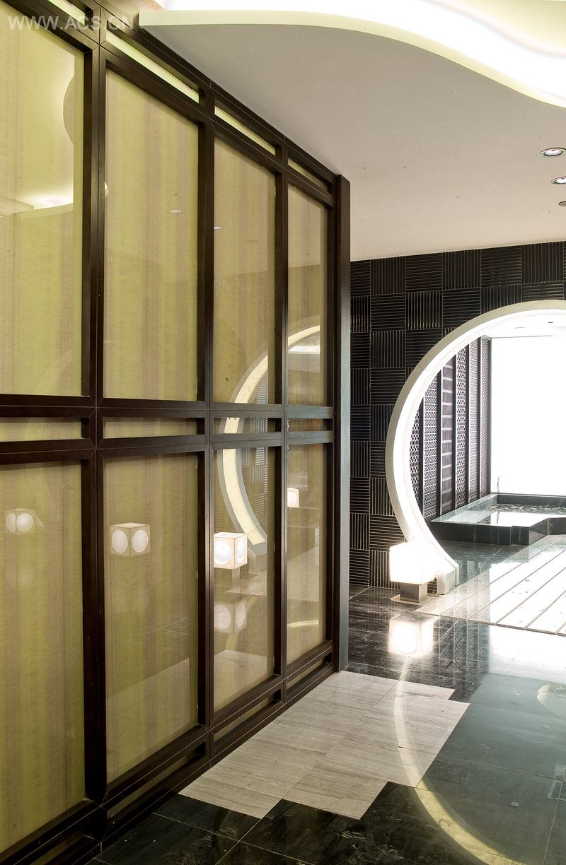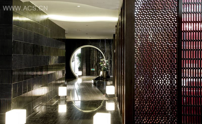 公共部分的墙面上采用了大面积的黑色玻璃条砖,代替园林式空间设计上常用到的望砖,既入题有使整个空间更加富有现代感。黑色材质的地面上点缀有直径1米6的瓷片拼花,都更加充实了空间的多样性、丰富性。