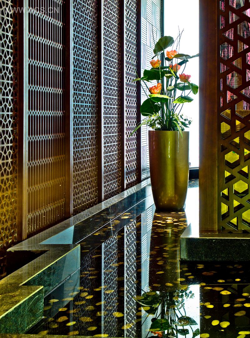 在空间转折上或采用大的白色灯箱,灯箱前布置花景,或采用镂空花格长窗,却起到了隔而不断地效果。既不会产生死角,同时也让人感觉到了空间上的延续。部分包厢以亭子的概念设计,以及地面花池、折桥形式的铺装,都有效的解决了密集包厢容易形成的重复单调感。