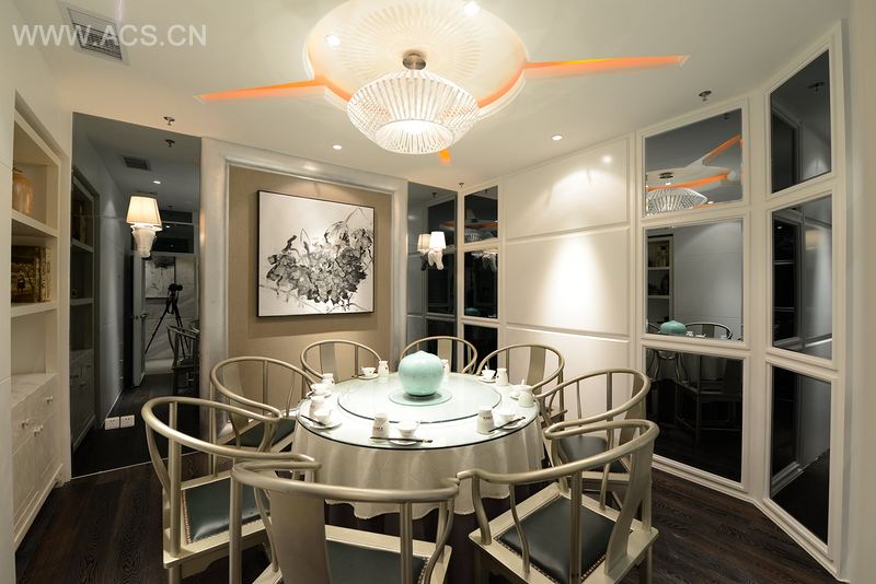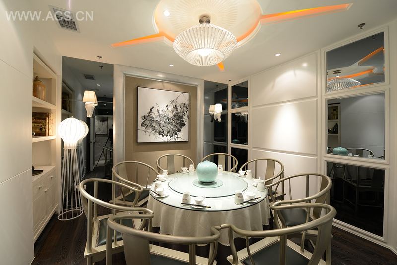 本案采用简洁的现代的手法,以白色、灰色的高度凝结,将空间、元素进行合理、大气的组合;以洗练的笔触,用纯净的手法,普通的材料营造动人的空间效果,表现出极其有内涵和独特的空间气质,将实用、时尚的新中式风格融在一起。对中式的风格进行了全新的诠释,用整体统一的色彩搭配,独特造型的鸟笼灯,白色中式椅等元素营造出诗情画意与现代都市精致的生活品味。