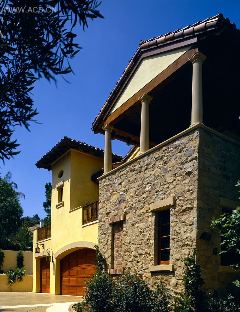 它的外观采用圣巴巴拉石头建造,让观者觉得房子有一定的历史了。砂浆从瓦片底下出来溢出来,使得圆柱形瓦片看起来像很久前盖上去的。所以最后来看,房子的不同部分看起来就像是逐渐加上去的。