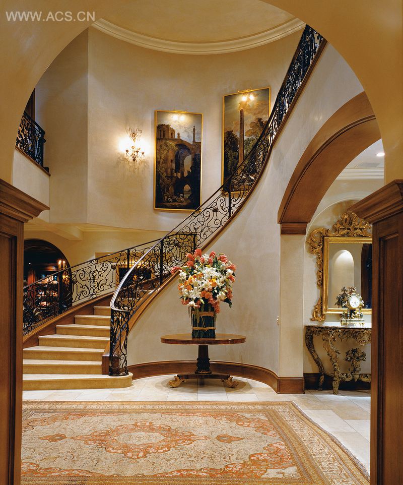清楚知道他的客户需要社交活动空间。除了正式的就餐间,他把他们的图书馆设计得优雅,温暖而休闲。主人们表现出了他们对于精致的艺术品和古董的热爱。因此设计师在图书馆摆设了两张十七世纪意大利巴洛克风格的椅子。壁炉是古典意大利红色大理石制作。而正式的就餐间装饰了一件十八世纪镀金木,洛可可水晶吊灯和十七世纪托斯卡纳餐具橱。