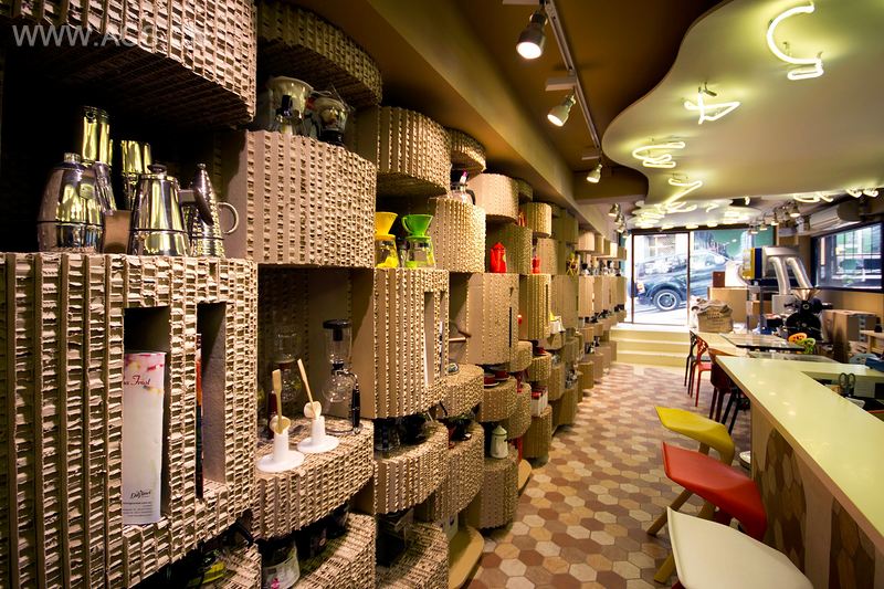 客户非常有环保意识,设计的核心部件是利用上千块回收的纸板制作而成,每块纸板都被单独切割,最终形成有机的波浪型产品展示墙,贯穿整个店面。随着时间的流逝,纸板会吸收咖啡的香味,最终成为室内芳香的一部分。
