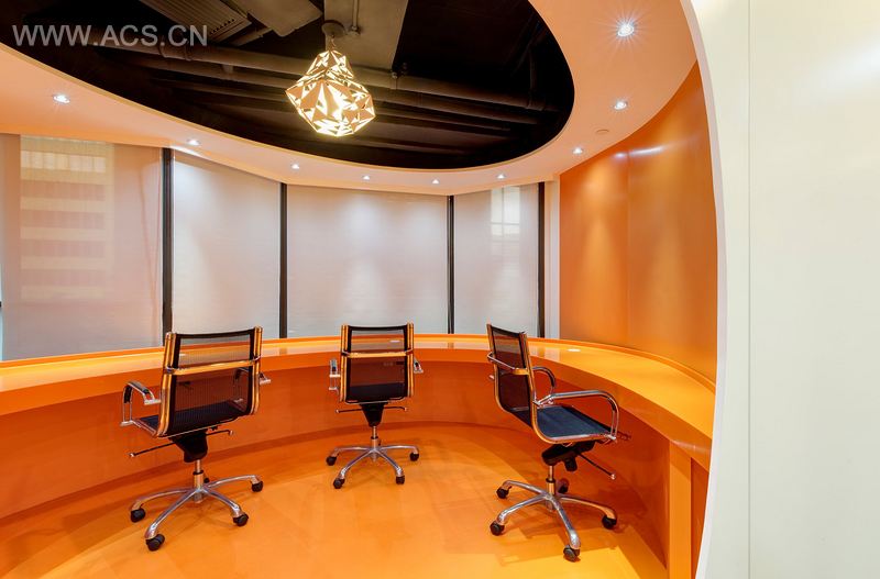 本案客户是维达——生活用纸产品的最大供应商之一,本案是对维达香港办公室的改造项目。空间规划基于其LOGO 的“海浪”理念,从主入口涌入工作空间。在接待区,设计师运用了简单的白色,接待柜台上设计了标志性的产品“卷纸”。此外,靠近接待区有一个小小的空余办公室,运了年轻活力的橙色,和其他地方的白色形成强烈对比。对于董事会议室,由于是用于召开重要会议的地方,设计师使用了木材饰面,亮黄色的椅子成为空间中的点睛之笔。