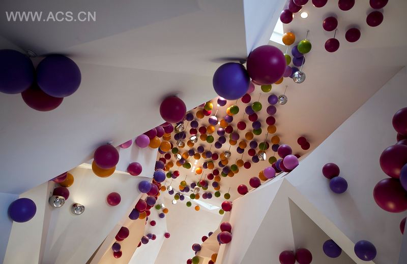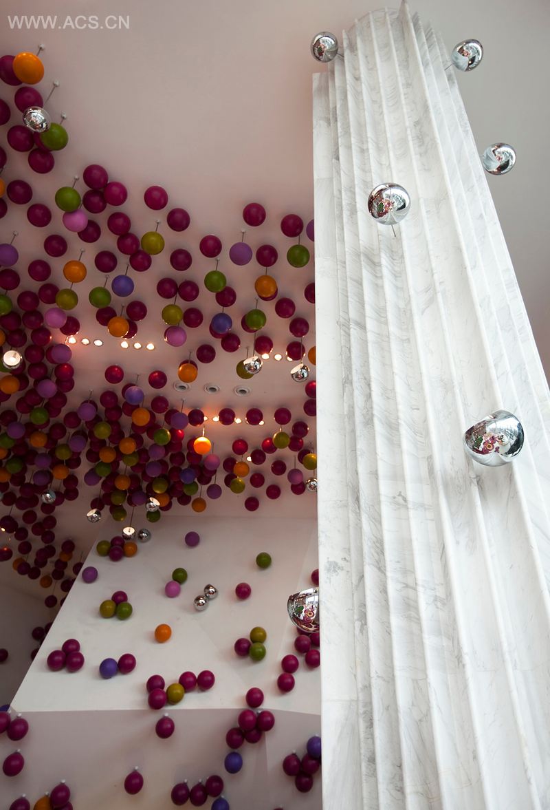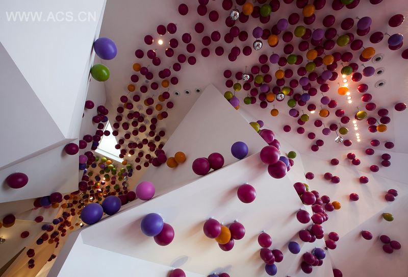 项目以“花城”命名,选择“花”和“万花筒”作为设计的主要元素。设计师运用不规则的墙面切割和各种颜色的球体装饰来模拟人们透过万花筒所看到的景象。人们对于万花筒的描述所用词汇通常是多边形、角度和人造。整个售楼处空间中,墙面和天花板都被设计成白色的多边形和三角形形状。设计师特意将墙面设计成不规则的凹凸三角形来描述万花筒千变万化的抽象形态。墙面上悬挂的七种不同颜色的球体象征着万紫千红的花朵映照在万花筒中,散乱而无序,正如扭转万花筒时所呈现的图像。设计师利用球体作为一种抽象的形式来阐述“花朵”在万花筒的影响下所呈现的景象,突出花本身最基本的结构要素。
