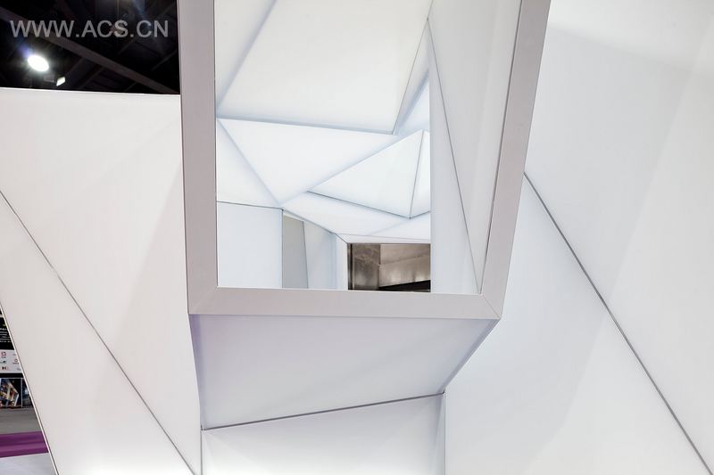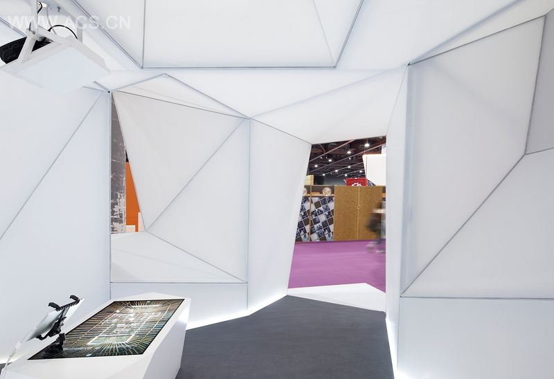 广州国际设计周“共生形态”馆是一个关于多维共时的空间装置,伸向四面的窗和门实现了展示空间内外的交互,同时也象征着包容、开放和多元化的企业理念。位于装置内的企业设计案例采用增强现实的交互展示技术,通过现实和虚拟环境的叠加,实现了展示形式由二维向多维的转换。