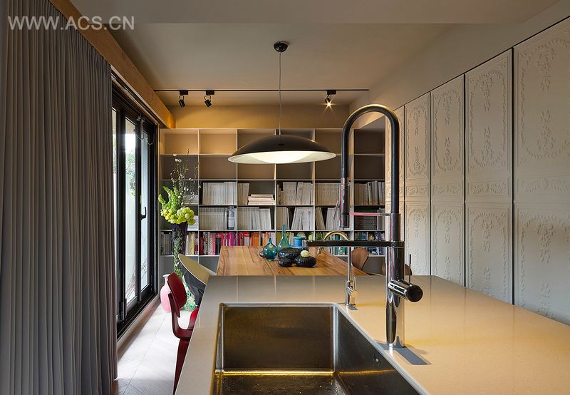 以转门颜色为基调,天花、壁面及衔接会议区与工作区的铁件书柜,皆配合采用浅灰色调。以两张木桌、厨具的铁灰色、大吊灯的黑色等,平衡色彩让空间变得沉稳,同时突显出色系丰富的家饰、书籍等,让这些常与人互动的物件都能成为空间里的主角。