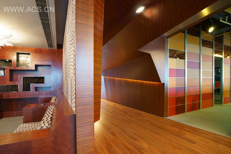 本案是该公司为贵宾客户设置的会所,也是办公空间。项目位于深圳。公司董事长是海南少数民族黎族人,这也是本案的设计灵感所在。贵宾休息室中有着设计师对于黎族标志的诠释。天花板的设计灵感来自于黎族人多个世纪以来使用的织布机。