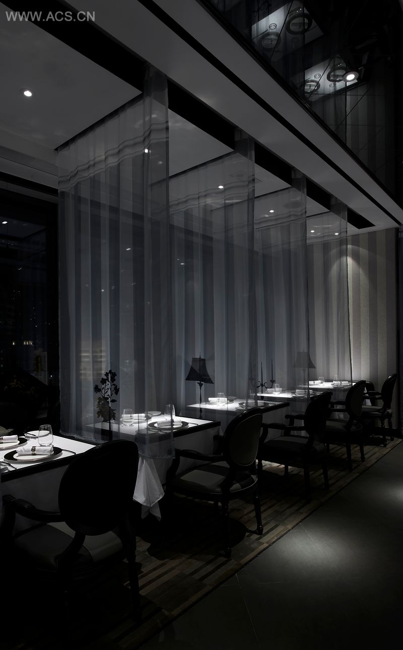 整个餐厅应用了单色调,低调的座椅突出了食材的鲜活。空间中的细节和家具的设计都经过精心考虑。隐私是这一层次的餐厅需要考虑的重要因素,定制的遮蔽物有着古老宅邸起居室中家具的剪影,有趣地定义了每张桌子的空间。桌面上的照明经过了精心安排,确保照亮每个盘子,如同舞台上的灯光,绝不会漏照任何一个演员。