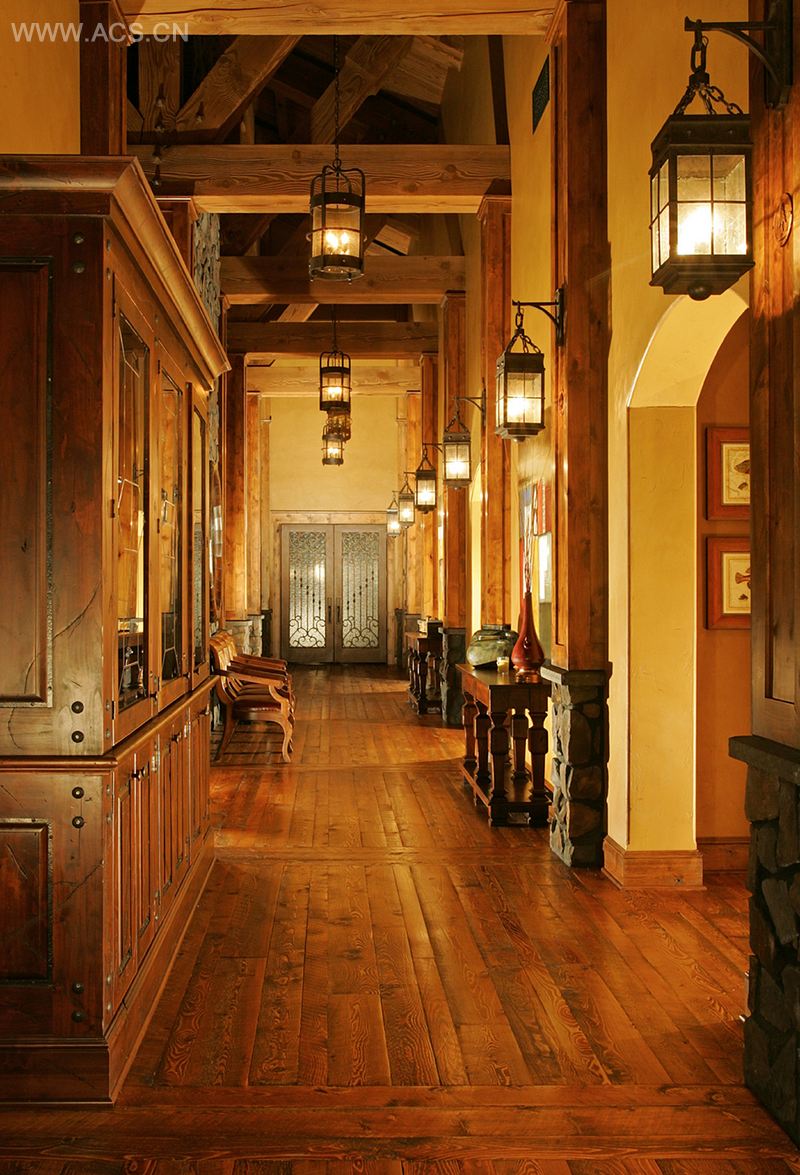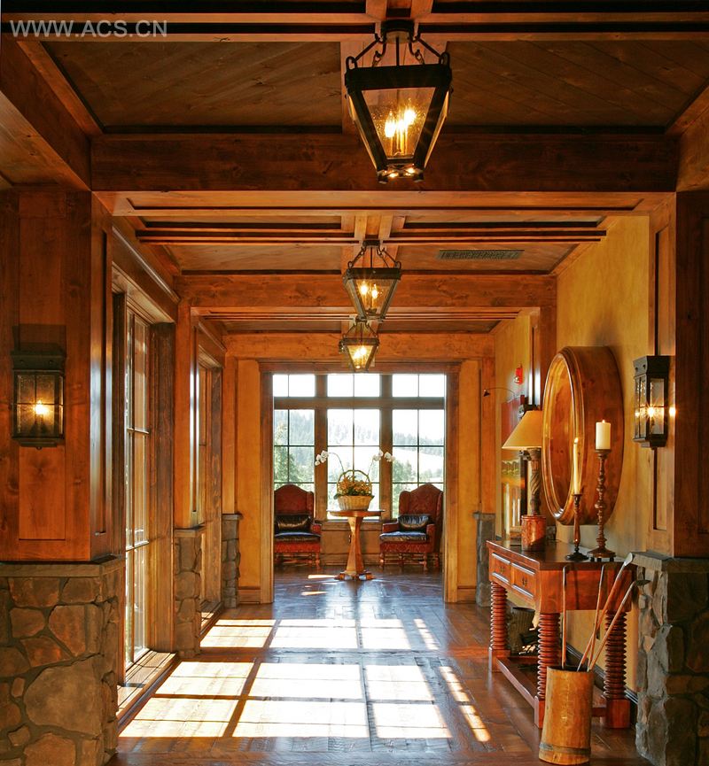 会所内部也以木为主题,营造温暖舒适之感。家具和织品体现古朴风格,使室内设计与建筑结构相一致。长绒毛的超大型家饰,既舒适又亮眼;织品多选用暗红、棕色、绿色等阳刚之色,配以一系列的皮革材料,使其与周围的自然景色相呼应;定制的铁制照明灯为大型空间营造不经意的复杂感。