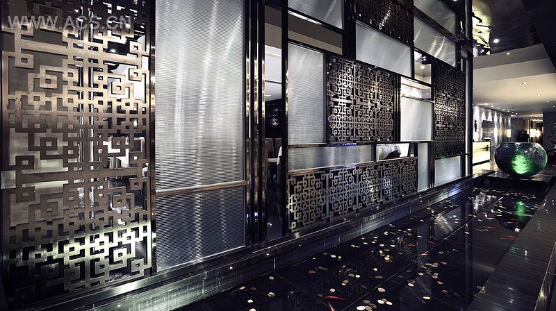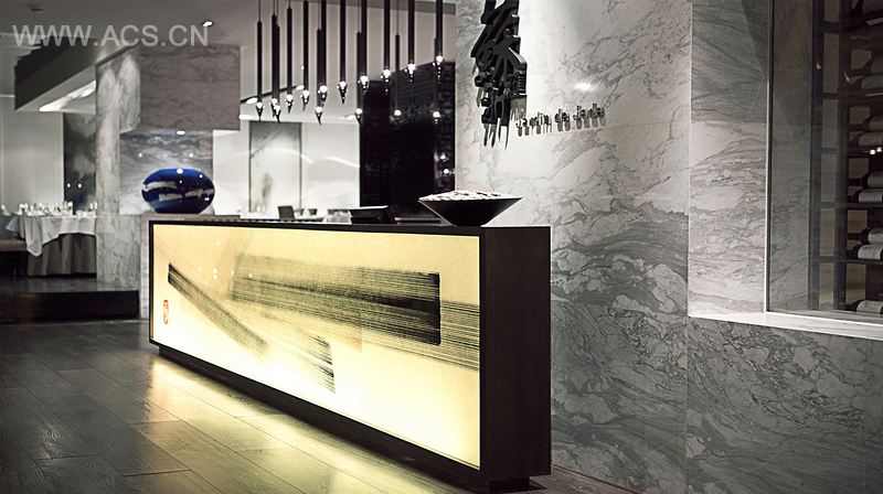 位于北京的新概念中式餐厅,设计概念的灵感源自于中国山水画之泼墨艺术,在视觉冲击的同时更调弄出氤氲山水之气,把中国传统艺术以崭新的设计手法融汇结合。首先映入眼帘的是黑色金属窗花与艺术玻璃相结合的半透明屏风,增加了透视和层次感。纯白的毛笔造型立体墙与艺术屏风的组合正是设计的灵魂所在,秉承了国画的留白艺术,体现了中国文化讲究虚实相生的玄妙。