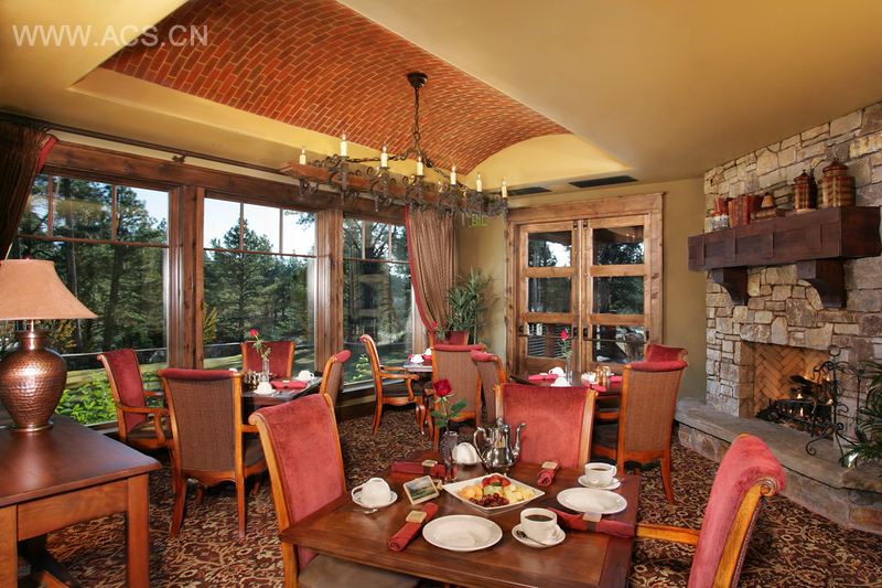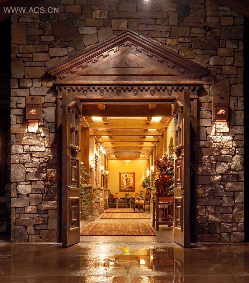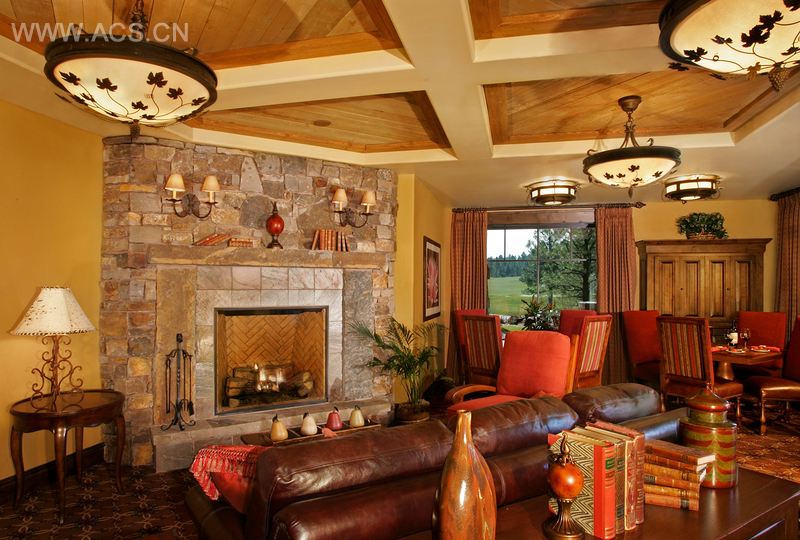Pine Canyon会所位于亚利桑那州弗拉格斯塔夫镇,环绕着该镇的是国家森林田园风光,会所则坐落于一片高耸的黄松林之中。两层式高尔夫球会所呈现田园风格,设计成互相连接的结构。建筑外部装饰有多彩碲化砂岩、劈裂木隔板、石板和仿铜的生锈钢屋顶。一系列的尖形屋顶可以抵抗沙漠降雪,并以刚硬的松木结构作支撑。手工雕琢的木制门结实耐用,迎接着光临此地的客人;内部空间设有高高的拱形天花板、厚重的木制构架以及四方的壁炉,示意客人在此休息。定制的灯具呈现松树枝桠的造型,体现了田园式的细节处理。会所还拥有专享的水疗和健身中心,其木屋式主题与主会所相一致。