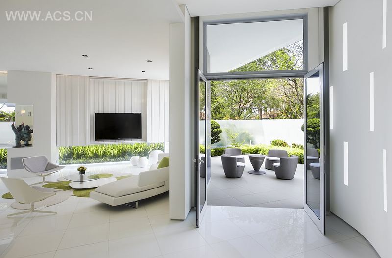 本案运用了两种简单的弯曲板,一个垂直一个水平,来定义其内部空间。设计由内至外,室内空间不存在闭合和静态。
