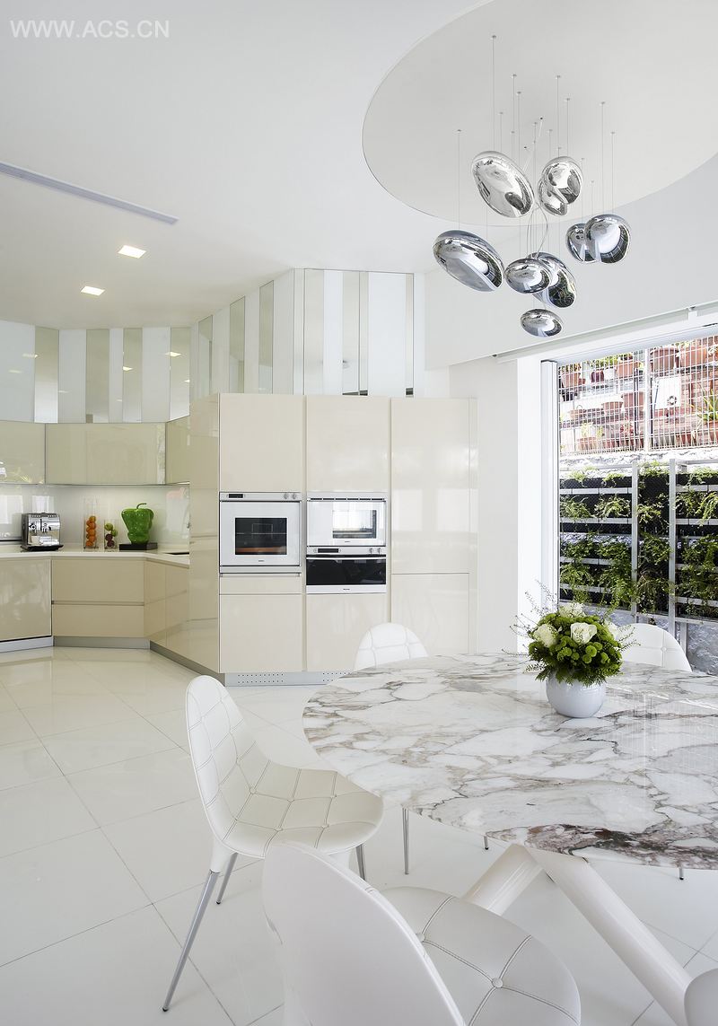 起居空间延伸,越过其内边界,直至户外庭院的墙界。同样地,用餐空间被水平曲面半包覆着,会呼吸的绿色墙面成为天然的有机背景。自然的图景被用作垂直墙面的材料,沿着楼梯,将支架屋从地下室至顶楼联系起来。