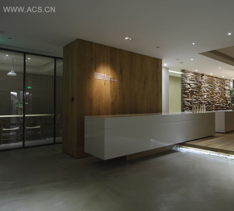块的组合、面的穿插,设计师以简练的笔法营造轻松宁静的办公环境;原木条块堆叠的墙面传递着企业的团队精神;自然的原木素材呼唤着纯朴的隽永……