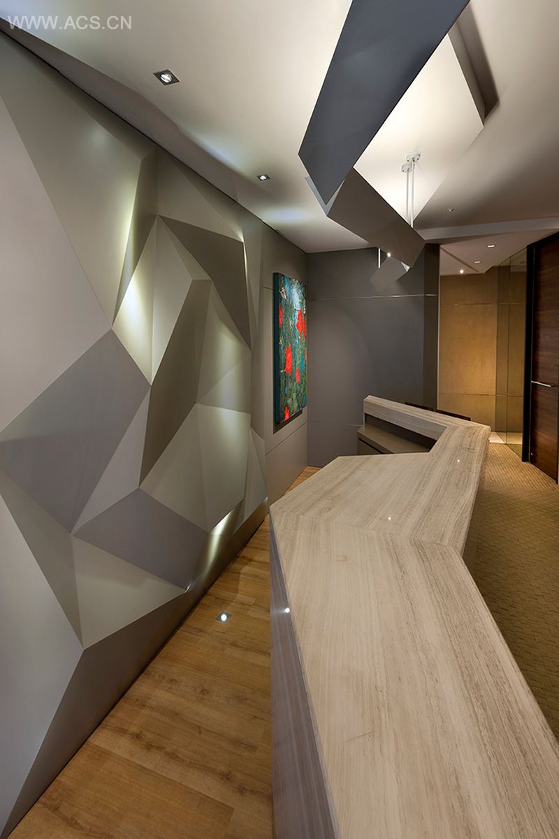 吧台本身即是一件艺术品,由富有纹理和色彩的大理石制造而成。几何形状的吧台是整个空间的亮点,进一步突出了棱形的背景。地板和天花板上的灯光代表着光辉。