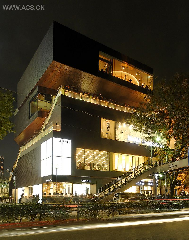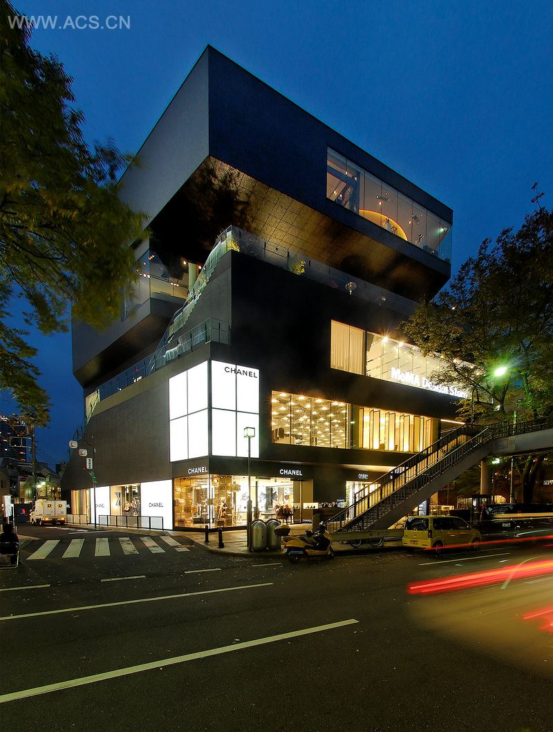 最近,日本参表道地区新建了一系列引人注目的新建筑,这些“方盒子”都有一个宏伟的外观和相对谦虚的内部。建筑多数为大型时装品牌旗舰店,它们似乎都非常注重它们的外形及立面的设计质感。这个设计注重安排参观者的垂直运动路线,比传统的时尚品牌旗舰店更加具有亲和力,少了所谓的时尚“名牌”店的排他性。