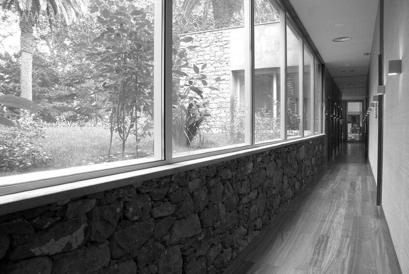 该建筑通过分隔新旧建筑物的玻璃隧道与旧的那栋建筑物相连。与自然相通的这种特性也体现在内饰上,空间遵循一个合理的分工,始终与外界相协调,但又极大程度地控制了空间和外部的联系。享受这里的田园风光和轻松的环境固然重要,但保障客户的隐私也是必要的,因此,我们非常谨慎地开发通往外界的出口,在某些情况下,我们选择了可以直接与自然接触的舒适的封闭庭院。