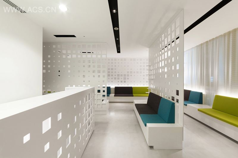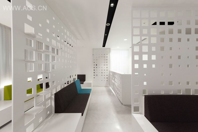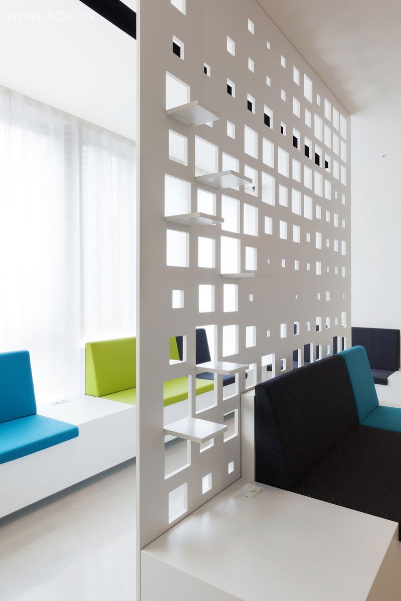7楼是候诊室,可供许多病人咨询挂号。穿孔的MDF板被用作病人和员工之间的隔板。滑动门、架子和墙纸上都有孔洞图案。增加空间的深度同时保证一定的隐私。