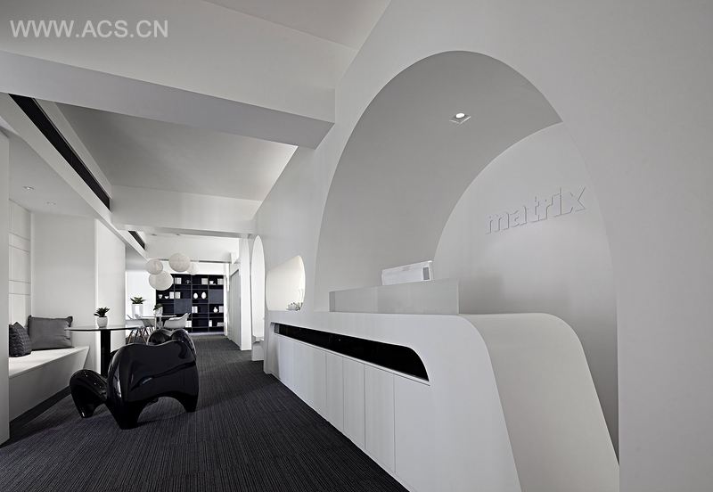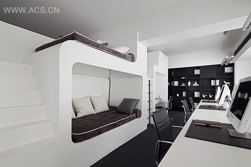 办公室的平面布局,传统且常规,但玄机尽在其中。中间的长条形盒子通过变形、挤压、掏空,成为一个包含了前台、休闲、娱乐、办公的奶酪似的装置。它沉浸在这黑白的空间里,显得如此洁白和纯粹,而员工身处其中,内心会被这洁白所净化,思想会被这纯粹所打动。moooi 品牌的黑色焚烧系列家具令办公室与众不同。纯粹的黑白需要纯粹的装饰,国际著名品牌moooi 将黑白进行到底。