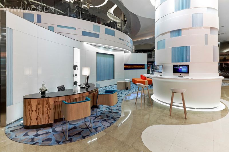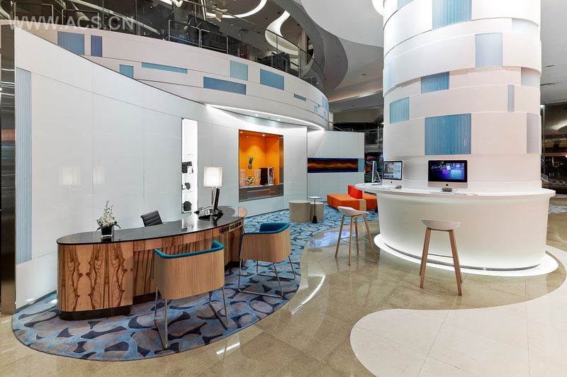 全新的大堂休息室使用了双曲面玻璃墙作为背景,将行李间巧妙地隐藏起来。中心的立柱和隔层板上包覆着中等密度的纤维板,成为空间的焦点。立柱底部呈有机形态的“电脑角”供酒店客人使用。