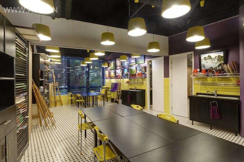 本案选用了最具功能性的设计。空间被划分为美术馆和艺术空间。在有任何需要的时候,美术馆空间都能被轻易地改造成活动场所,可容纳50 名以上的活动参与者;抑或是供10 名学生参与的弹出式临时课堂。旋转式嵌板的设计想法使得展示空间和可悬挂的画作数量倍增。