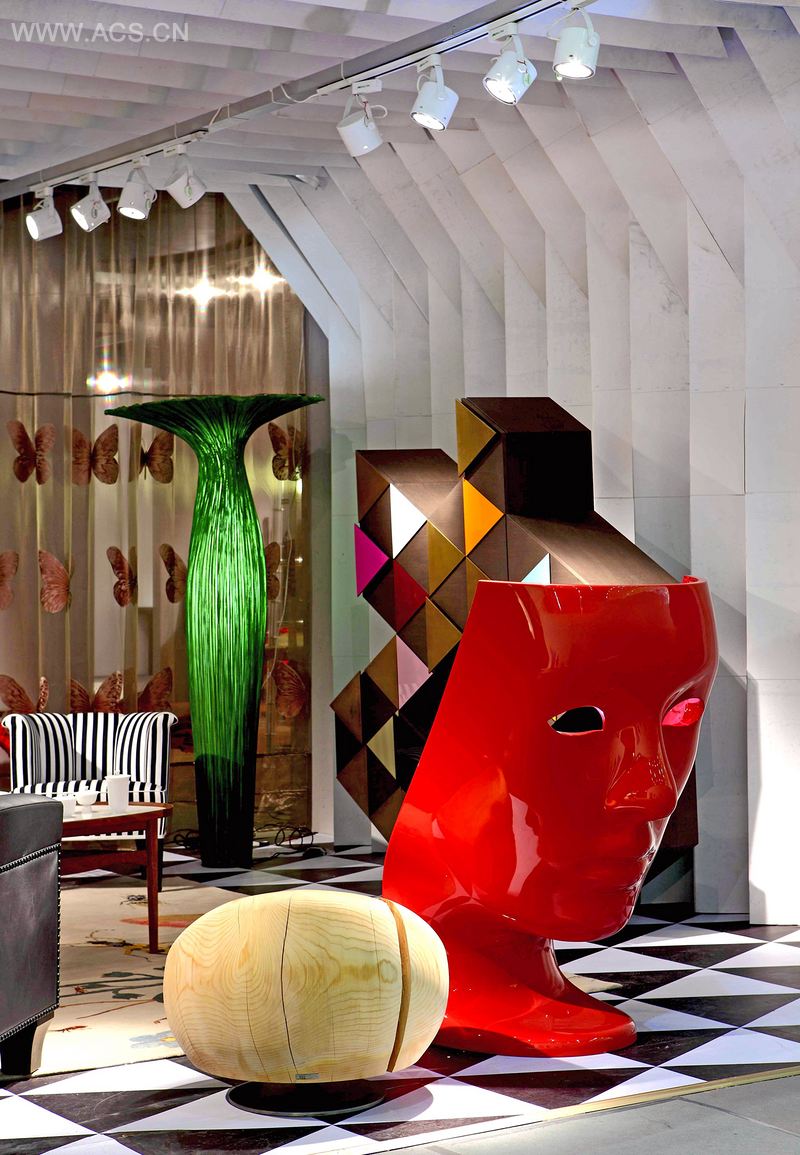 这里是梦幻的仙境,离奇的幻想空间。参观者的视线穿过红色人脸形状的椅子,漫步在这个奇妙的世界中。本案的设计灵感来自于经典童话故事——爱丽丝奇境记。在3.6m 高的白色空间中,展示了设计师对于真实和梦幻的想象。黑色和白色的交替运用,配合亮红色、翠绿色和木色的大胆使用,赋予空间强烈的自然氛围。在舞台背景下,每个区域都如同一个小小的魔幻舞台,由兔子先生引领着爱丽丝不断前行探索……