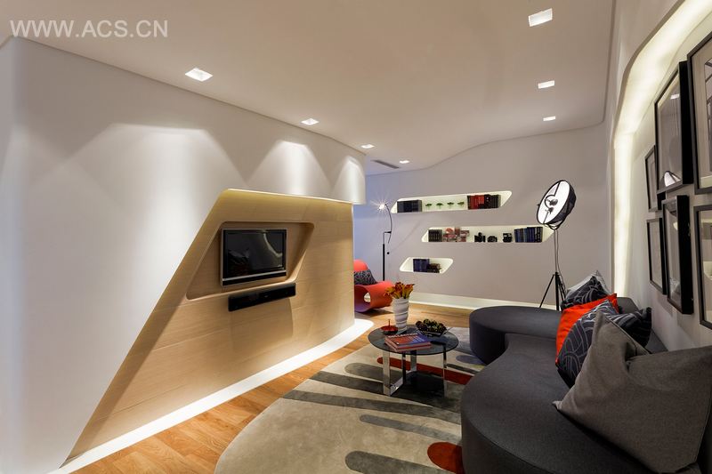 从房门进来是一面延伸至前方的流体型墙壁。白色的石膏板塑造出延展状空间,通过构建工厂加工,工人娴熟的技术打磨成适应整个建筑形态的无棱角墙面。室内围绕着白色,力图在较小的环境创造更大的空间。整体设计由三种主要材料构建——白色石粉,木料及透光亚克力。浅色的木饰面结合白色墙壁加上流线的灯光可以带来简约温馨、干净柔和的居家感觉。