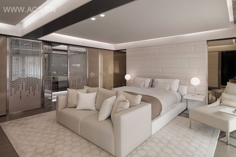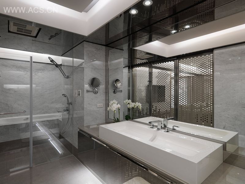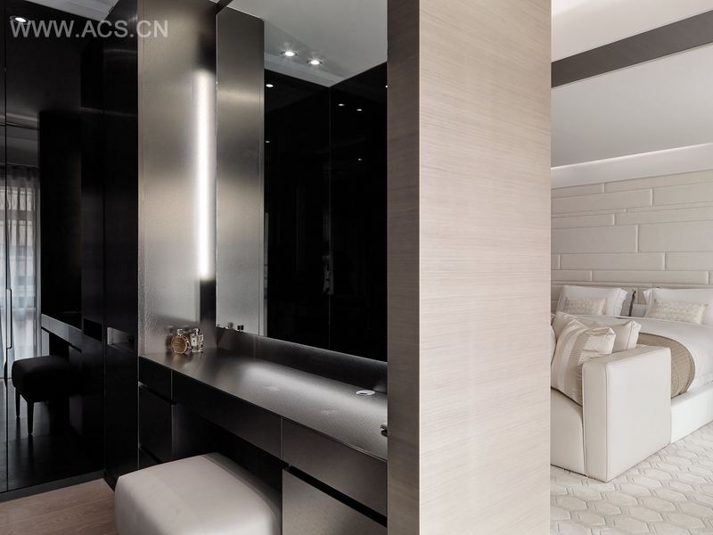 以玻璃丶金属丶黑白色调融合经典语汇线条呈现都会新女性特质。公共空间以六角隔屏界定场域关系,前后黑丶白流动墙面平衡空间重量感,并延伸其语汇至天地壁。天花镜面光带设计转化结构低矮问题。卧室以六角元素搭配灰褐色调诠释女性柔软氛围。