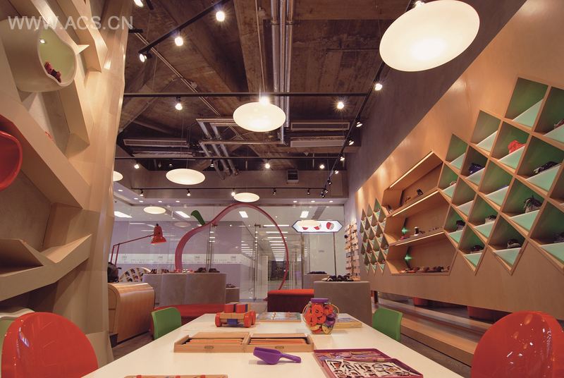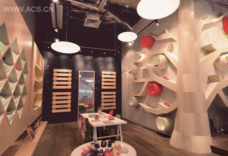 前者体现在环境及儿童友好的材料的运用,主要是木材,与塑料的家具截然相反,后者则体现在一些异想天开的室内设计,包括明亮的红苹果形状沙发和富有想象力的墙面陈列。