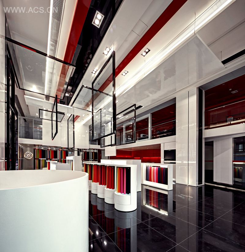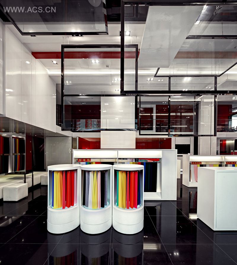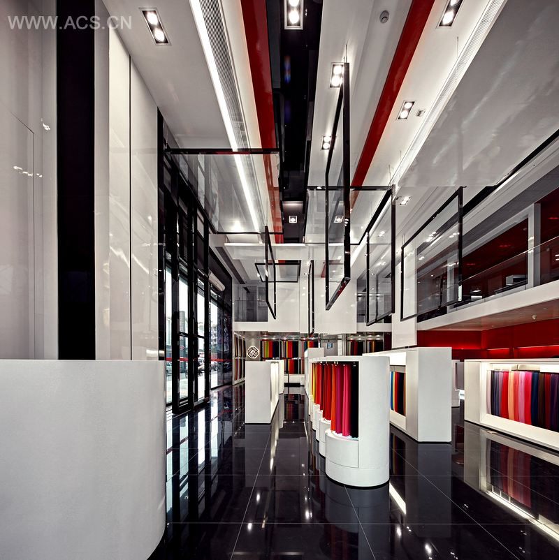大厅中央的布艺展示台,从天花一直延续到立面,用布匹与玻璃划割出空间,突出了不同质感的材料之间有序组合,为空间增添了跳跃的气氛。整个空间约有6米高,针对不同的布料、款式,使用较高功率的LED灯,产生清晰的色彩,很好地强调了展示物品的立体质量,创造引人注目的商店场景。一个个装置感很强的展架,令产品可以随意组合。