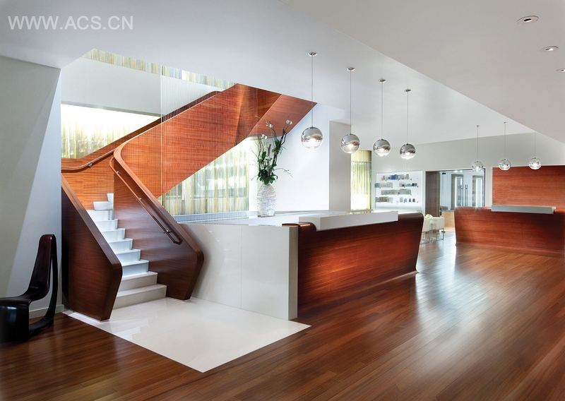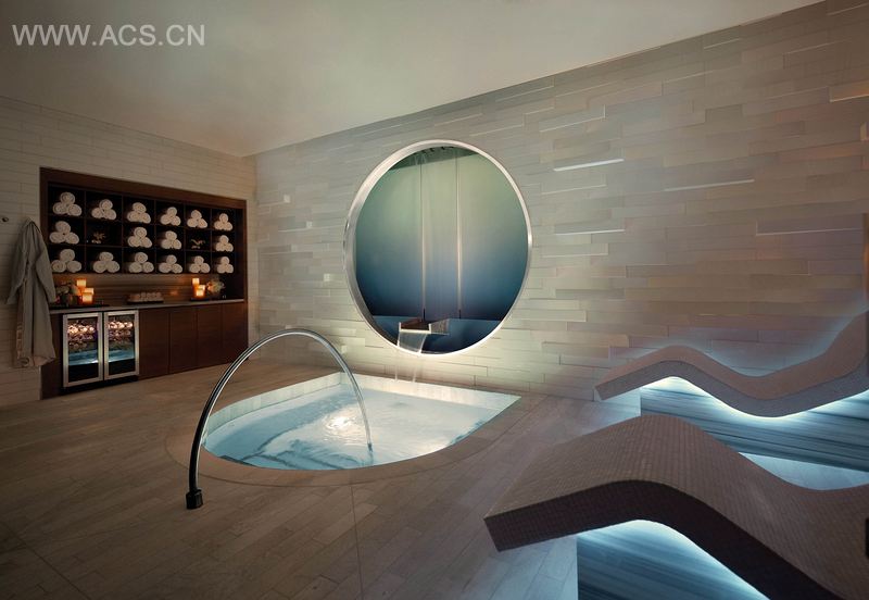 Vdara中心有两层,每一层都有独特的设计表达。酒店升降梯直接连通第一层的接待区。顾客一进门,迎接他们的是舒缓的水流声,水由上游顺流而下,落入低地的反射水池。此层社交空间灯光通明,顾客可以在水疗精品店闲逛,或在香槟吧品尝美酒,或在美发沙龙享受全方位服务,或在健身室释放自我。经过白色玻璃和沙比利实木制成的曲线楼梯,顾客可以到达上一层。再绕过接待台和水景观,顾客即可开始体验水疗服务,净化身心。